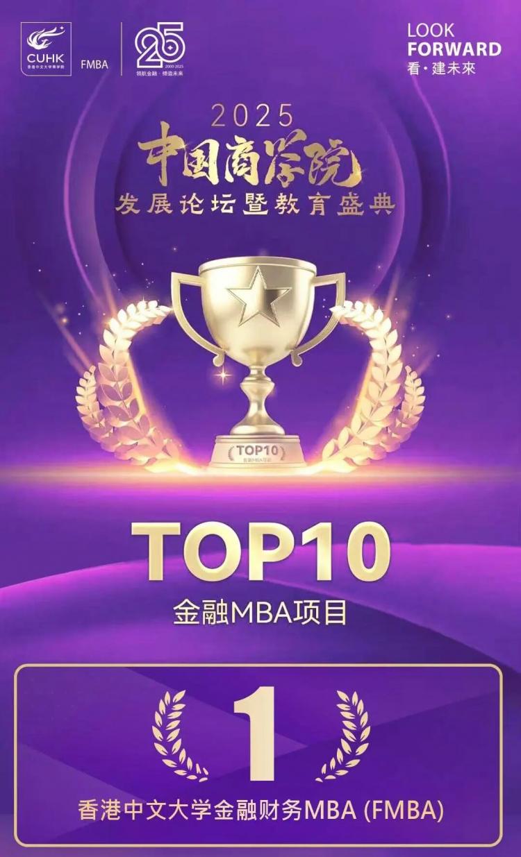 香港中文大学金融财务MBA(FMBA)获评2025年度中国商学院"最佳金融MBA项目TOP10"第1名!