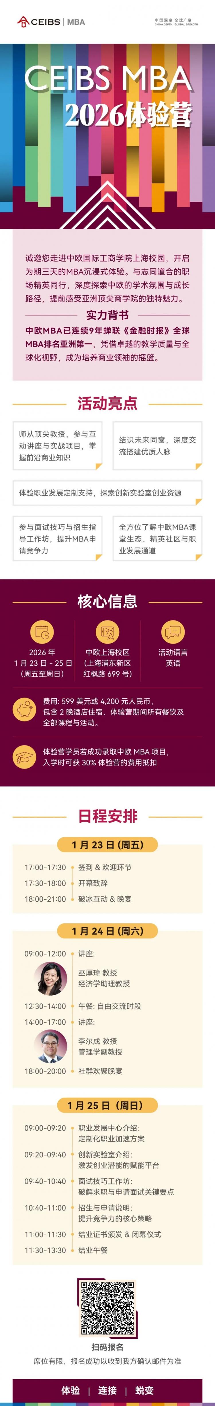 中欧MBA体验营提供为期三天的沉浸式课程体验,让参与者深度了解亚洲排名第一的商学院。活动包括近期举办的CEIBS MBA开放日,定于2025年12月14日(星期日)13:30至16:30(GMT+8)举行,以及MBA虚拟信息会议,安排在2025年12月15日(星期一)20:00至21:00(GMT+8)。参与者可通过点击“阅读原文”或相关链接进行注册报名,以获取更多详细信息并加入这些活动。
